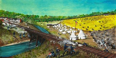 Black troops of the 14th USCT make an all-out charge to stop Confederate cannon from breaking their pontoon bridge into Decatur, Alabama in October, 1864.